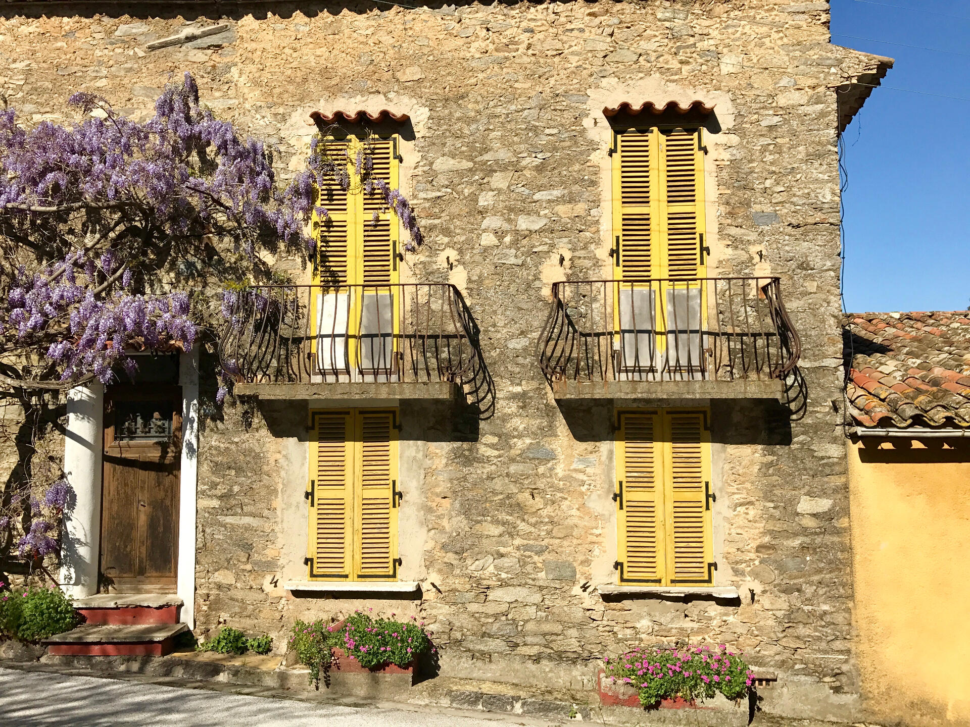 The ground floor opens onto a porch covered with Wisteria, as well as to the main terrace, which is a perfect sun-trap in winter. During summer, dappled shade from the magnificent fig tree reduces sunlight. A solid old-stone wall on the side protects from the breeze in winter, which makes it our all-season favorite lunch spot.